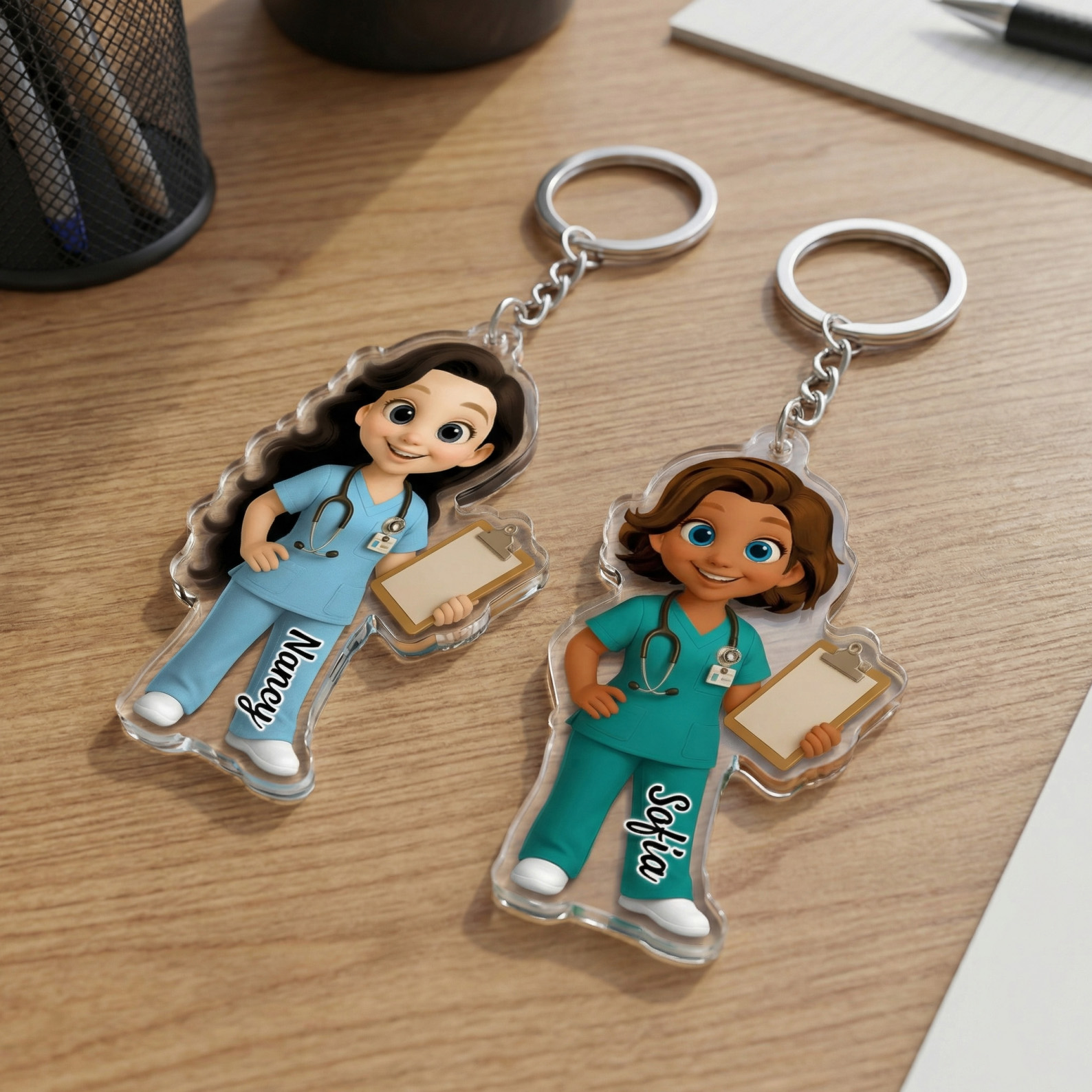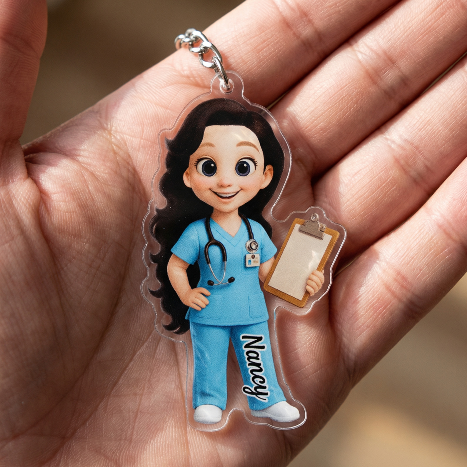 Custom Nurse Character Keychain – A charming acrylic keyring featuring a cartoon nurse in scrubs, holding a clipboard and stethoscope. The 3D-style figure is detailed with expressive eyes and lifelike posture for a joyful, personal touch.